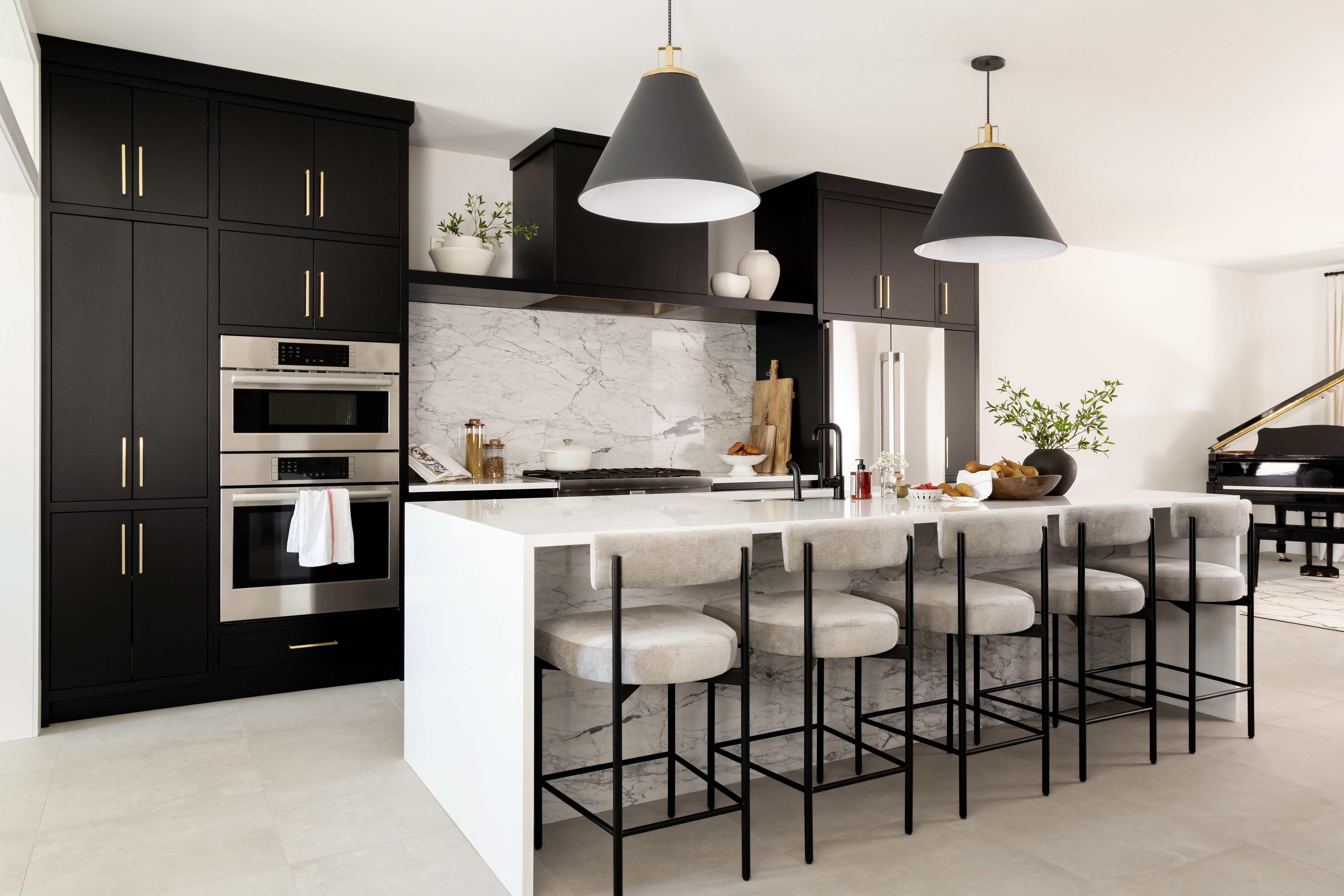 A stunning modern kitchen with clean lines and contemporary finishes. Features flat-panel cabinetry, integrated handles, and a sleek waterfall island countertop.